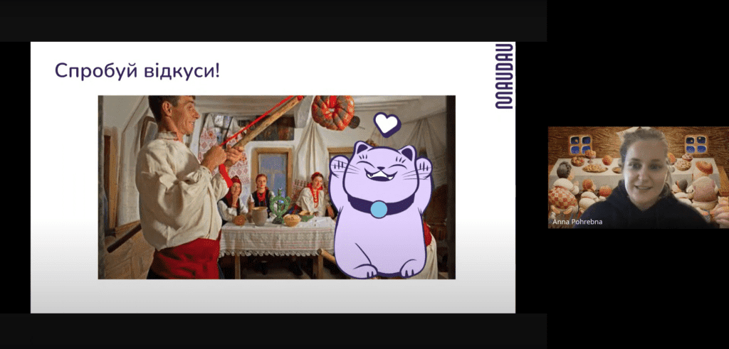 Наприклад, ось так у MAUDAU виглядають різдвяні зустрічі. На фото наша People Partner Аня розповідає про традиції свята Андрія Первозванного (Калити) під час Різдвяної Печа-Кучі.