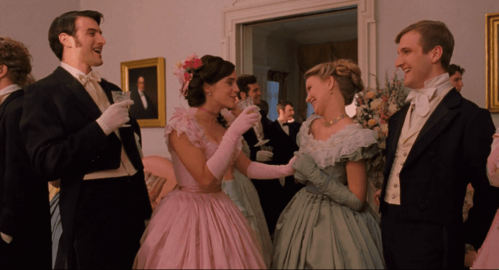 Мег із келихом у фільмі з’являється лише раз — на балі дебютанток її приятельки Енні Моффат. У фільмі цій подорожі приділений лише невеликий епізод, тоді коли в книзі — цілий розділ. Ймовірно, дівчина пила шампанське, адже воно було популярним серед заможних американців у ХІХ столітті. З великою ймовірністю в келиху міс Марч було вино від Veuve Clicquot, Moët & Chandon або Perrier-Jouët.