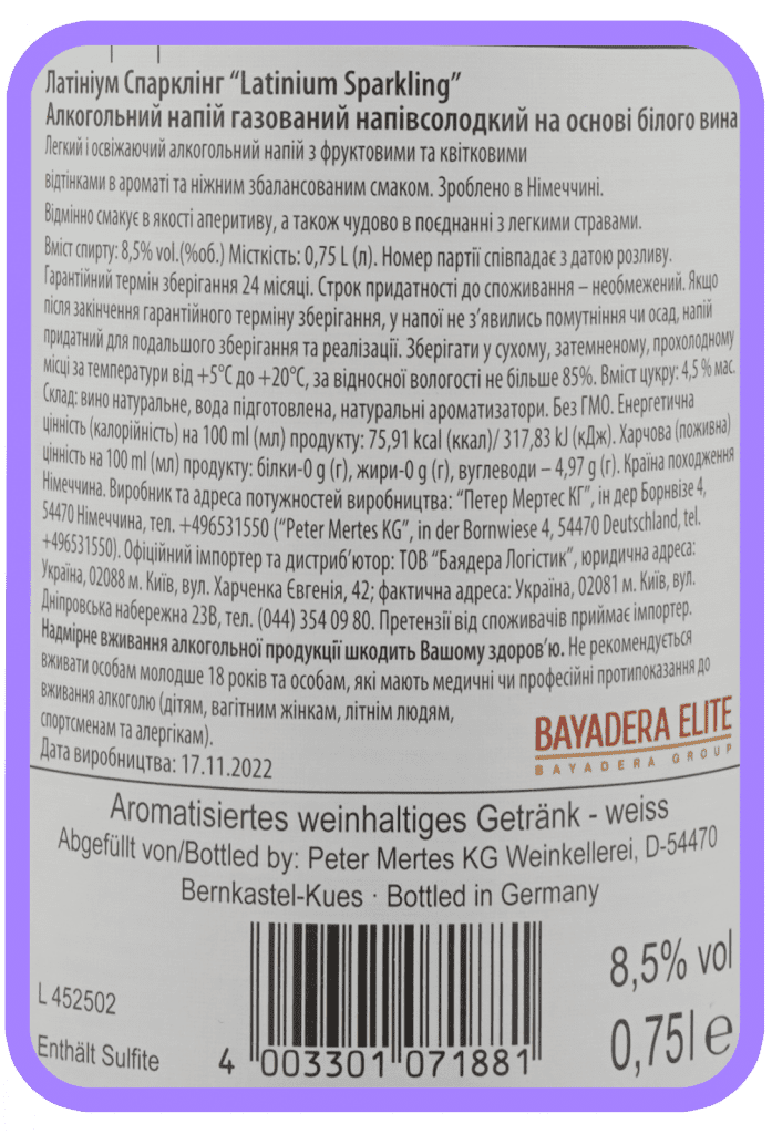 Німецьке ігристе вино золотисто-солом’яного кольору, яке за декілька років також полюбилося українцям. Latinium Sparkling виготовляють у регіоні Мозель, комуна Рейнхессен.