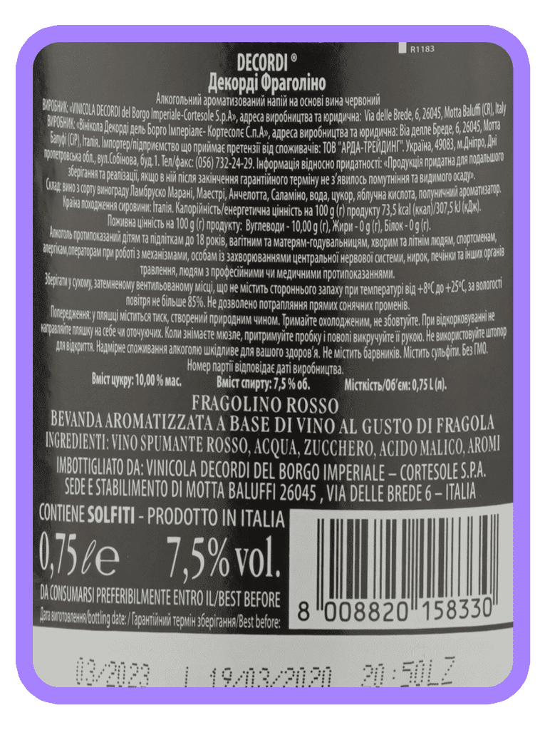 Decordi Fragolino Rosso має насичений ягідний смак. Адже для створення, окрім червоного класичного вина, використовують сік суниці та полуниці. Саме плоди цих ягід додають солодкість напою. Якщо любиш ароматизовані ігристі напої, то цей варіант прийдеться до смаку.
