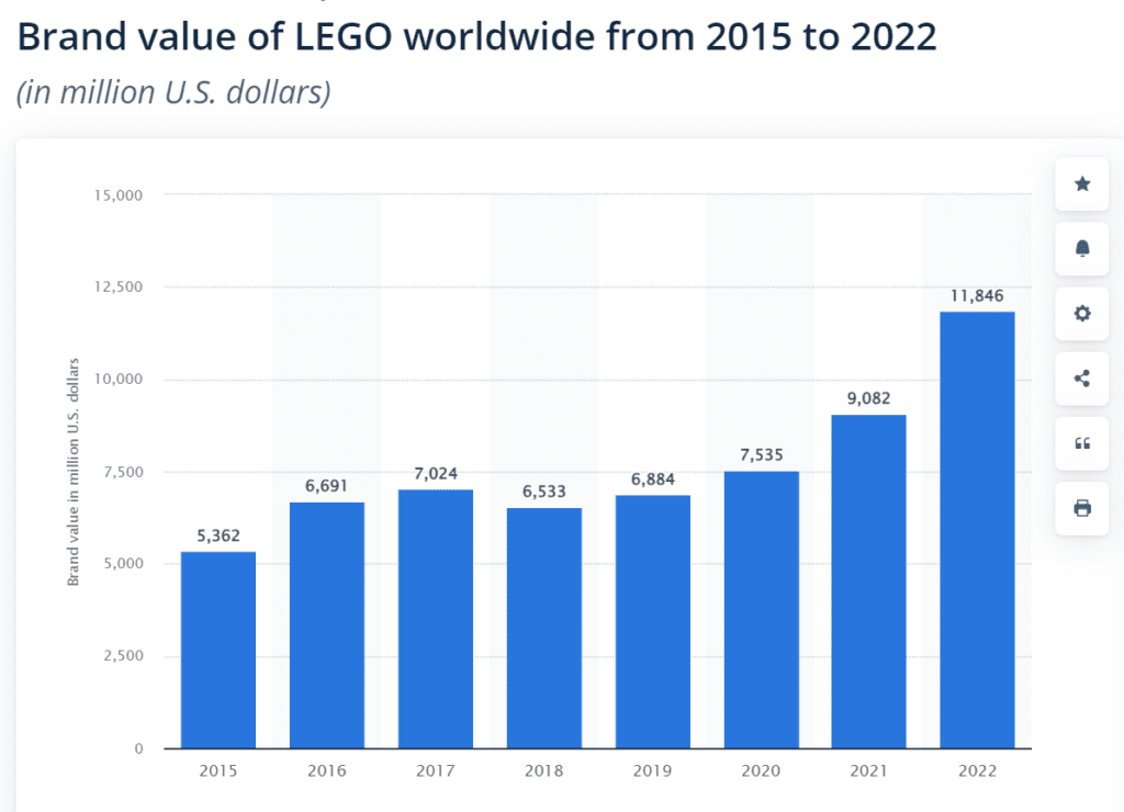 - Під час пандемії коронавірусу у 2020 році прибуток Lego зріс на 11 %. Це підтвердило її статус найбільшої компанії-виробника іграшок.
